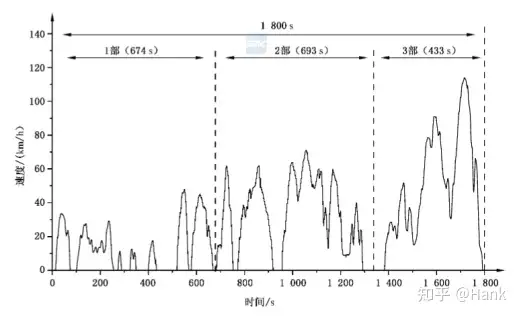 试验循环工况采用CATC工况(乘用车为CLTC-P,见图3,商用车为CLTC-C),如果车辆申报的最高车速小于循环工况的最高车速,那么目标车速大于车辆申报车速时,按照GB 18352.6-2016的规定对试验循环进行修正。下图是CLTC-P循环工况曲线。