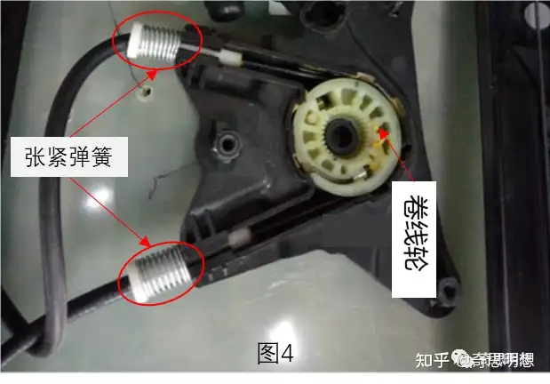 升降器钢丝绳张弹簧:起到系统张紧作用,防止钢丝绳松弛失效,见图4