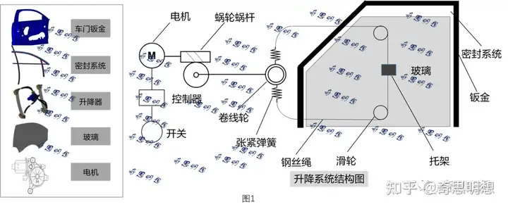 车窗玻璃的开闭功能是通过车门玻璃升降系统实现的,该系统主要包括车门钣金、密封系统、升降器、玻璃、电机、控制器以及开关组成,见图1。