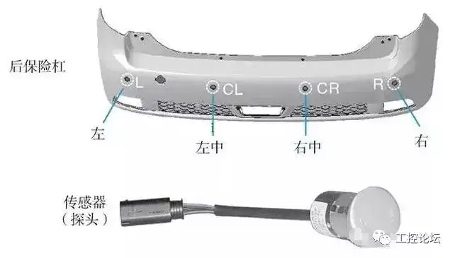 倒车雷达传感器俗称探头,安装在后保险杠上,包括左、左中、右中、右传感器,由外向内嵌入式安装,如下图所示。各传感器的安装位置都有规定,不能装错,否则可能引起误报警。
