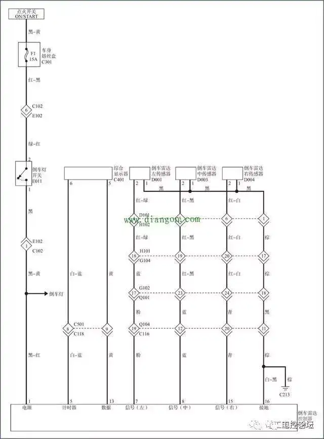 ④ 倒车雷达控制器端子5 和13 连接至综合显示器端子6 和5,进行数据传送,将倒车雷达控制器的信息反映到综合显示器上。