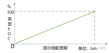 满电(soc=100%),续航显示公告续航里程值;没电(soc=0%),续航显示为零;一半的电量(soc=50%),续航显示1/2(公告续航里程值)